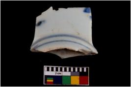 | Description / विवरण | Specimen has a glossy white surface with blue painting over it. |