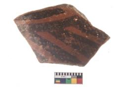 | Description / विवरण | Specimen of a potsherd with black decorative geometric painting on it. It have group of oblique lines set two horizontal bands. |