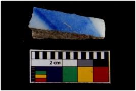 | Description / विवरण | Specimen has a glossy white surface with deep blue painting over it. |