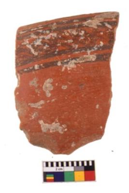 | Description / विवरण | A specimen of a potsherd. It is reddish in colour with black decorative geometric painting on it. |