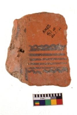 | Description / विवरण | A specimen of a potsherd. It is reddish in colour with black decorative geometric painting on it. |