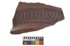 | Description / विवरण | Specimen of black on red ware with decorative geometric Vertical strokes set in two horizontal bands painting. |