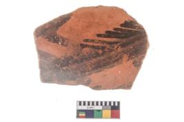 | Description / विवरण | Specimen of potsherd black on red painted pottery. It is fine fabric in sharp contrast with painted design are executed in black pigment. |