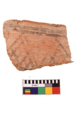 | Description / विवरण | A specimen of a potsherd. It is reddish in colour with black decorative geometric painting on it. |