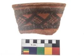 | Description / विवरण | Specimen of potsherd with black decorative geometric diamond set broad horizontal bands painting. |