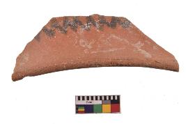 | Description / विवरण | Specimen of black on red ware with decorative geometric A row acrhes over a horizontal band painting. |
