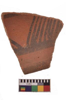 | Description / विवरण | Specimen of black on red ware with decorative geometric Groups of oblique strokes set in horizontal bands on the exterior painting. |