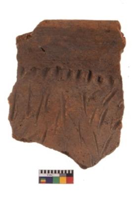 | Description / विवरण | Specimen of fine red ware; it shows incised decoration pattern on its exterior. |