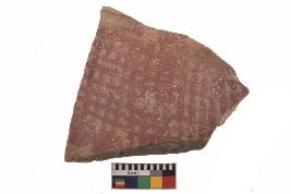 | Description / विवरण | Specimen of red on red ware with decorative geometric Two horizontal bands containing criss-cross pattern painting. |