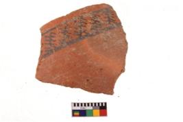 | Description / विवरण | A specimen of a potsherd. It is reddish in colour with black decorative geometric painting on it. |