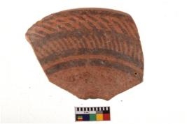 | Description / विवरण | A specimen of a potsherd. It is reddish in colour with black decorative geometric painting on it. |
