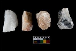 | Description / विवरण | Specimen of cores with weathered cortex and several broad fluted marks. Some of them are irregular in shape, whereas some are tapering at one end. |