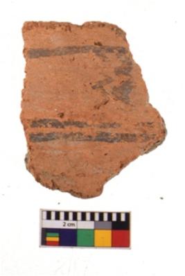 | Description / विवरण | A specimen of a potsherd. It is reddish in colour with black decorative geometric painting on it. |