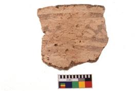 | Description / विवरण | A specimen of a potsherd. It is reddish in colour with black decorative geometric painting on it. |