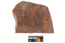 | Description / विवरण | A specimen of a potsherd. It is reddish in colour with black decorative geometric painting on it. |