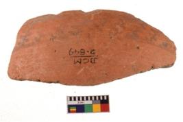 | Description / विवरण | A specimen of a potsherd. It is reddish in colour with black decorative geometric painting on it. |