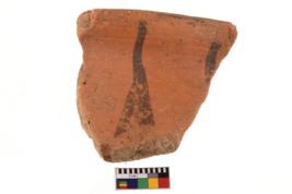 | Description / विवरण | A specimen of a potsherd. It is reddish in colour with black decorative geometric painting on it. |