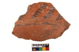 | Description / विवरण | A specimen of a potsherd. It is reddish in colour with black decorative geometric painting on it. |