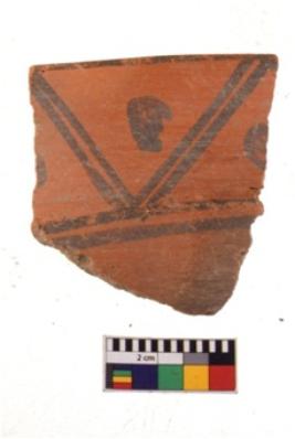 | Description / विवरण | A specimen of a potsherd. It is reddish in colour with black decorative geometric painting on it. |