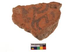 | Description / विवरण | A specimen of a potsherd. It is reddish in colour with black decorative geometric painting on it. |