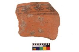 | Description / विवरण | A specimen of a potsherd. It is reddish in colour with black decorative geometric painting on it. |