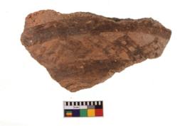 | Description / विवरण | A specimen of a potsherd. It is reddish in colour with black decorative geometric painting on it. |