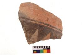| Description / विवरण | A specimen of a potsherd. It is reddish in colour with black decorative geometric painting on it. |