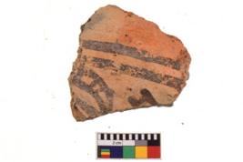 | Description / विवरण | A specimen of a potsherd. It is reddish in colour with black decorative geometric painting on it. |