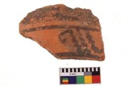 | Description / विवरण | A specimen of a potsherd. It is reddish in colour with black decorative geometric painting on it. |