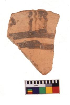 | Description / विवरण | A specimen of a potsherd. It is reddish in colour with black decorative geometric painting on it. |