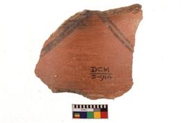 | Description / विवरण | A specimen of a potsherd. It is reddish in colour with black decorative geometric painting on it. |