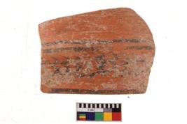 | Description / विवरण | A specimen of a potsherd. It is reddish in colour with black decorative geometric painting on it. |