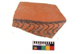 | Description / विवरण | A specimen of a potsherd. It is reddish in colour with black decorative geometric painting on it. |