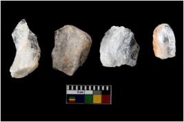 | Description / विवरण | Specimen of cores with weathered cortex and several broad fluted marks. Some of them are irregular in shape, whereas some are tapering at one end. |