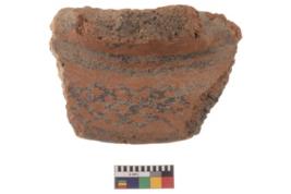 | Description / विवरण | Specimen of black on red ware with black decorative Lattice pattern geometric painting. |