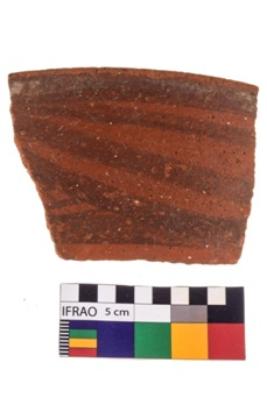 | Description / विवरण | Specimen of a potsherd with black decorative geometric painting on it.The potsherd is decorated with two horizontal bands, one on the rim and other on the body ,while between them are set of triple aches. |