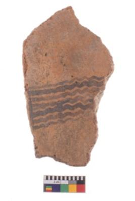 | Description / विवरण | A fragment of a potsherd. It is reddish in colour with black decorative geometric painting on it. |