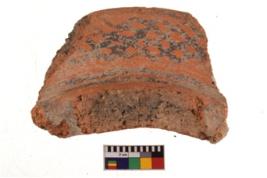 | Description / विवरण | A specimen of a potsherd. It is reddish in colour with black decorative geometric painting on it. |