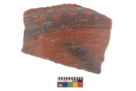 | Description / विवरण | A fragment of a potsherd. It is reddish in colour with black decorative geometric painting on it. |