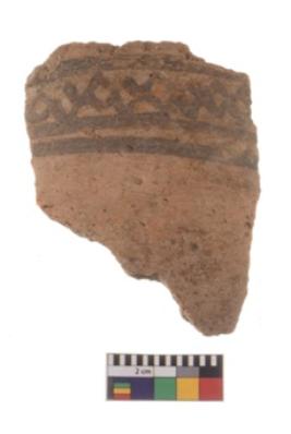 | Description / विवरण | Specimen of black on red ware with black decorative Lattice pattern geometric painting. |