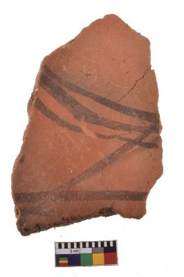 | Description / विवरण | Specimen of black on red ware with decorative geometric Curved lines painting. |