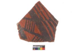 | Description / विवरण | A fragment of a potsherd. It is reddish in colour with black decorative geometric painting on it. |