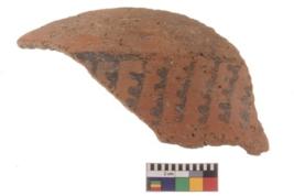 | Description / विवरण | Specimen of black on red ware with black decorative Parallel cross spike lines geometric painting. |