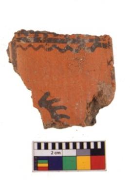 | Description / विवरण | A specimen of a potsherd. It is reddish in colour with black decorative nature painting on it. |