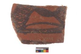 | Description / विवरण | A fragment of a potsherd. It is reddish in colour with black decorative geometric painting on it. |