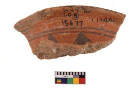 | Description / विवरण | A specimen of a potsherd. It is reddish in colour with black decorative geometric painting on it. |