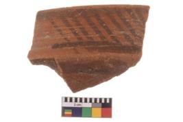 | Description / विवरण | Specimen of black on red ware with black decorative Parallel cross lines geometric painting. |