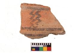 | Description / विवरण | A specimen of a potsherd. It is reddish in colour with black decorative geometric painting on it. |