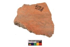| Description / विवरण | A specimen of a potsherd. It is reddish in colour with black decorative geometric painting on it. |