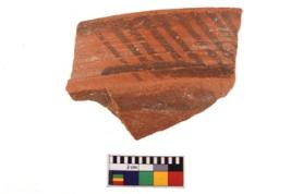 | Description / विवरण | A specimen of a potsherd. It is reddish in colour with black decorative geometric painting on it. |